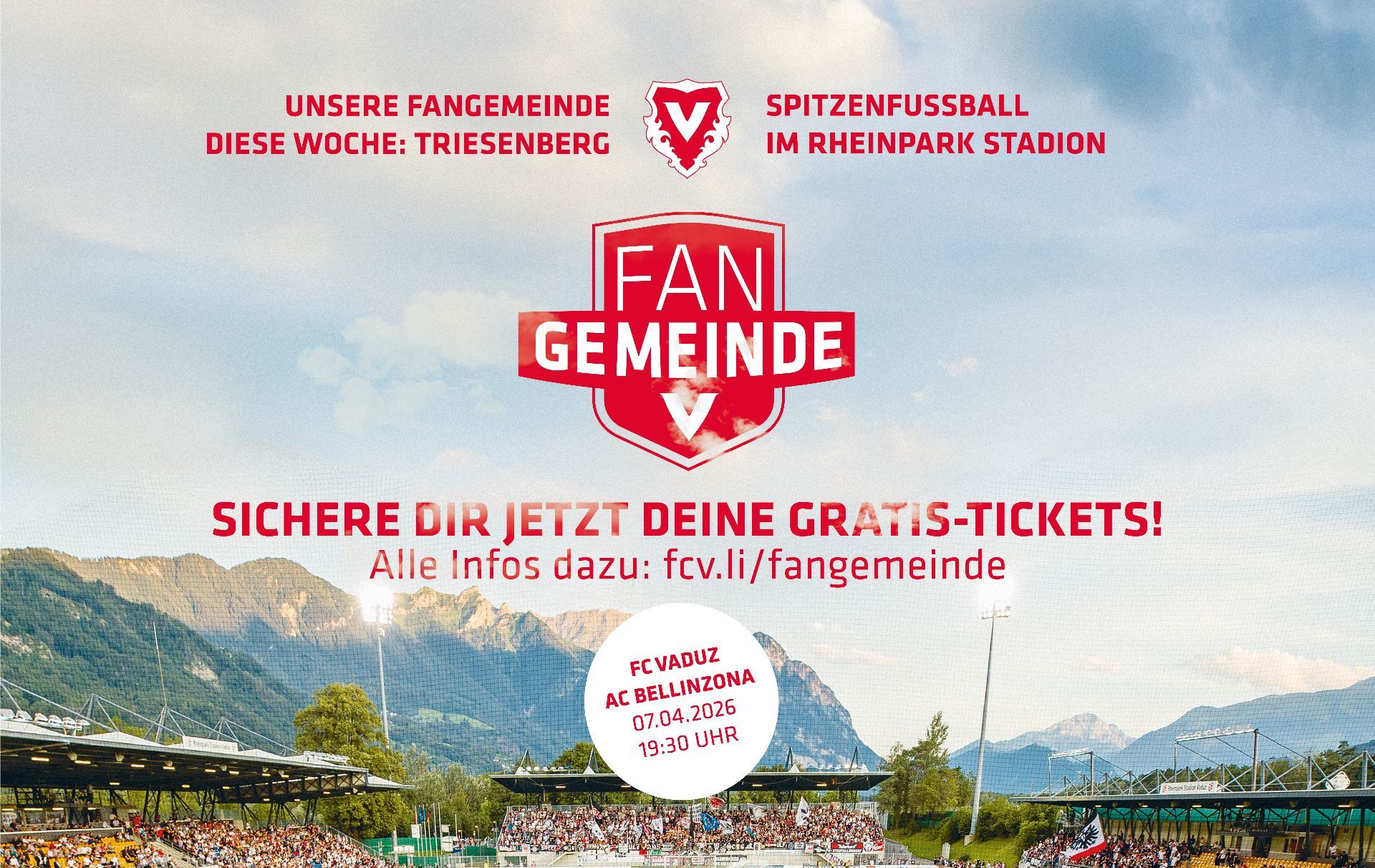 Mit der Aktion „Fangemeinde“ lädt der FC Vaduz nun die Gemeinde Triesenberg ein, Teil einer besonderen Geschichte zu sein – Holt euch eure Freikarten für das Heimspiel gegen die AC Bellinzona am Dienstag, 07.04.2026, ab sofort bis zum Spieltag in der Papeterie mit Herz in Triesenberg! Komm ins Stadion und zeige, dass Triesenberg hinter dem FCV steht – Hopp Vadoz! Alle Infos; www.fcvaduz.li/fangemeinde